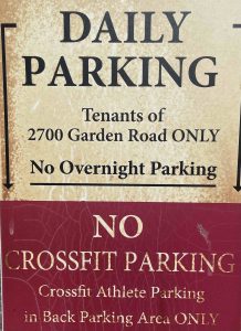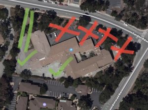 is in the back parking lot. Parking in the front lot is reserved for the other businesses in the complex. This back parking lot is accessed using a separate entrance off of Garden Road (see overhead view below). If you pulled into the front parking lot, take a left back onto Garden Road and then turn left into the very next driveway on your left. There is a sign indicating “Parking for First City Fitness athletes”. There is a fairly large dip as you enter the driveway off of Garden Road so take the turn into the driveway SLOWLY.